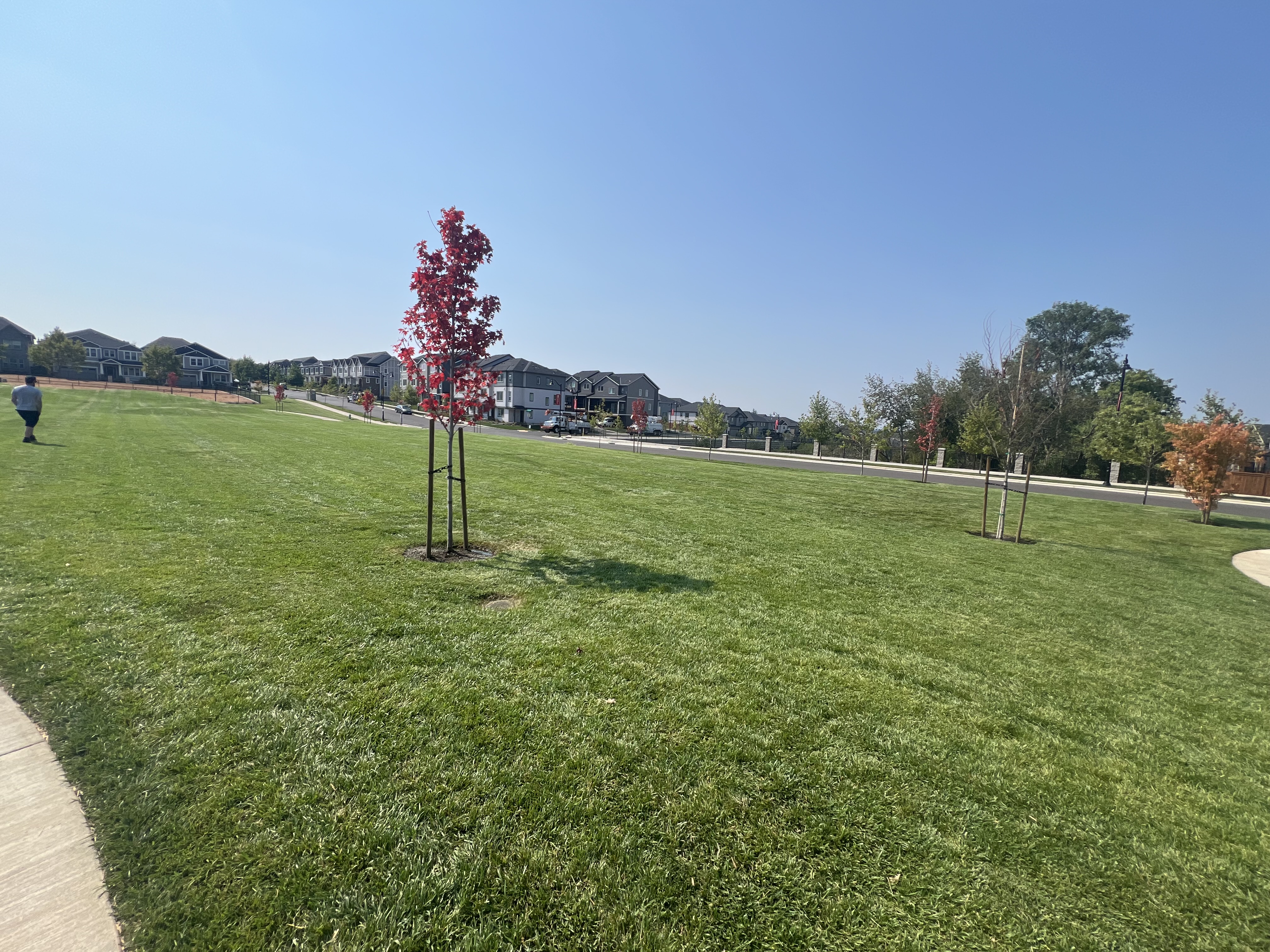 The park features a plaza with a shelter including BBQs, playground areas with several slides, climbers, and swings, and a paved pathway that meanders through the park. The south side of the park includes a dog run with a separate small/timid dog area. The grassy area is lined with trees and a flat, open area with grass mounds to run up and roll down.